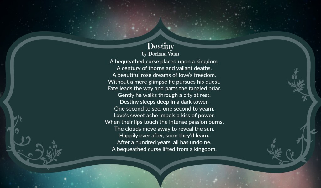 Also, here is my Sleeping Beauty poem, Destiny – which has the kiss we all expect.
